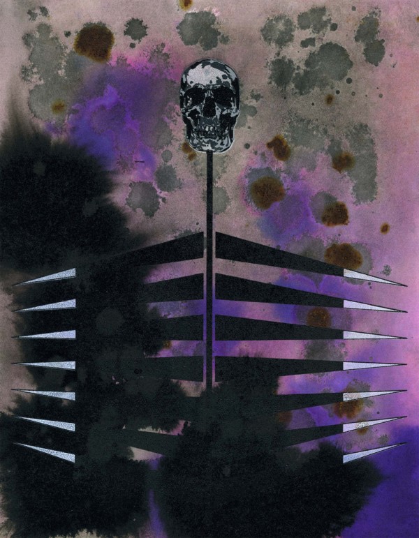 BV: The source material is collected from attending concerts, reading, and researching certain aspects of metal culture. For instance, Sam Dunn, Canadian anthropologist and heavy metal fan, has produced two documentaries that explore the origins of heavy metal music from early bands such as Blue Cheer and Black Sabbath, to current bands like Slayer & Mastadon. I recently read Lords of Chaos and just bought Only Death Is Real (An Illustrated History of Hellhammer and early Celtic Frost). These books offer an inside look into what goes on behind the scenes or after the music dies, literally, HA! More specifically, a few pieces are directly inspired by bands that use corpse paint. Influenced by the likes of Alice Cooper, KISS, and the Misfits many black metal bands paint their faces with black and white shapes to mimic inhumanity or death. I re-design these shapes into forms that mimic faces or objects associated with metal or the occult. I was initially inspired to start quilting after seeing the Gees Bend traveling exhibition, which showcases handmade quilts from a very rural region in Alabama. I had a lot of old Heavy Metal t-shirts hanging in my closet and thought it would be interesting to make a metal themed quilt from them. The result was a 6′ x 9′ quilt constructed with over 35 vintage heavy metal t-shirts from my own collection and a few purchased on Ebay. The quilting pattern (Red Stitching) forms a Pentagram shape when viewed from a distance. The quilt is entirely hand-made using a basic sewing machine and took roughly 3 months to complete.