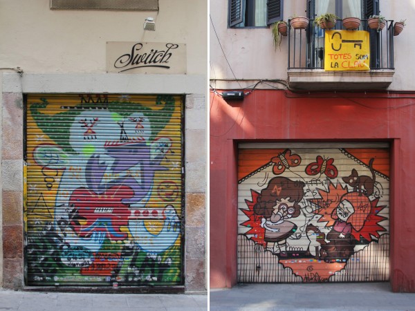The Guardian reported in their December 2010 article “Barcelona shopkeepers face fines over graffiti decoration” that city officials having been cracking down the street art, from graffiti tags to commissioned works, calling it “antisocial behavior” that “degrades urban fabric.” Sometimes the murals are decorative or creative works but often the paintings seems associated with the stores themselves, working as signs. The quality of the murals varies from door to door and even if not great art, they add to the city’s character.