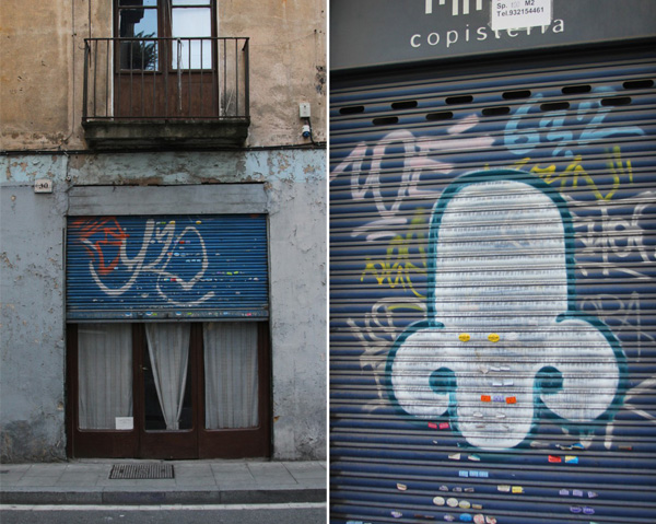 A need to protect property has endowed Barcelona with a kind of blank canvas, the shutters that guard the glass windows of shops. Doors roll down over the whole storefront, blocking the ability to window-shop while the store is closed. Then, there is art that comes to fill the void.