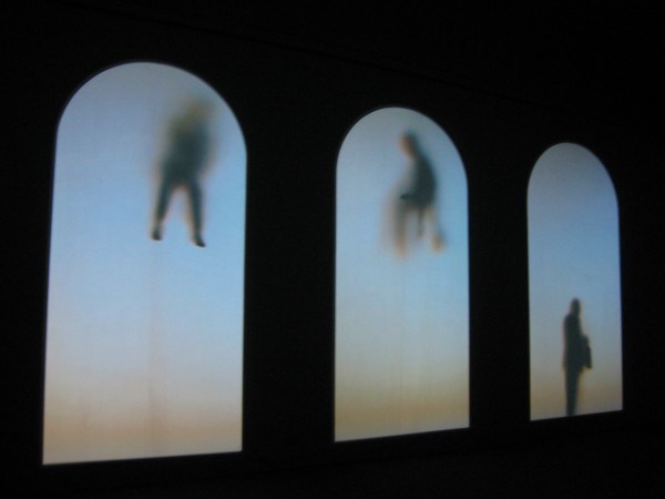 Guests is realized by the projection of large-scale windows physically surrounding the viewer on the walls and ceiling of the darkened Polish Pavilion. The windows create an invisible but obvious barrier that cannot be crossed by the shadowy, silhouetted figures behind them. It is clear that these figures are immigrants and refugees through the installation’s accompanying sound element featuring voices discussing their struggle for work visas, opportunity, and national identity. These stories are pulled from Wodiczko’s own research into the experiences of immigrants from around the world residing in Poland and Italy. Throughout the length of the looping installation (approximately 17 minutes) various vignettes of people come in and out of focus as they are alternately burdened with luggage, washing windows, blowing leaves, sweeping, and selling umbrellas. In a few poignant instances the shadowy figures look inside, touching the window panes, underscoring their exclusion.