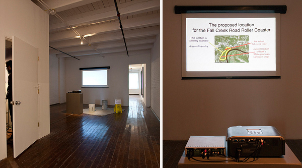 On the other end of the spectrum is Jonn Herschend’s many-sided conceptual, Self Portrait as a PowerPoint Proposal for an Amusement Park Ride.  The installation is characterized by a strong sense of narrative, not strictly limited to straightforward vignettes or mimetic representation. In his complex self-portrait one finds a narrative that resembles fantasy, role-playing, fiction and a touch of reality. Herschend’s choice of subjects and materials contribute to the kind of story he opts to tell and show his audience.
