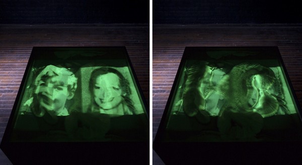 Among the offerings is Paul DeMarinis’ new work, Dust.  With this work DeMarinis explores facial similarities, pairs of faces, and the abstraction of images into the dust. DeMarinis presents a fragment of this collection of likeness-pairs, scanned sequentially into the light-memory of phosphorescent powder. After a few minutes of exposure to the projected image, the powder retains a faint green image of the two faces on its surface, something akin to the ‘latent image’ of photographic film or the veil of memory. Unlike photographic film, though, the image starts to distort. Propelled by low frequency sound vibrations, the powder starts to flow and dance, first distorting the faces and erasing their likeness, then distorting them into patterns of abstract light in motion, with form and beauty all its own.