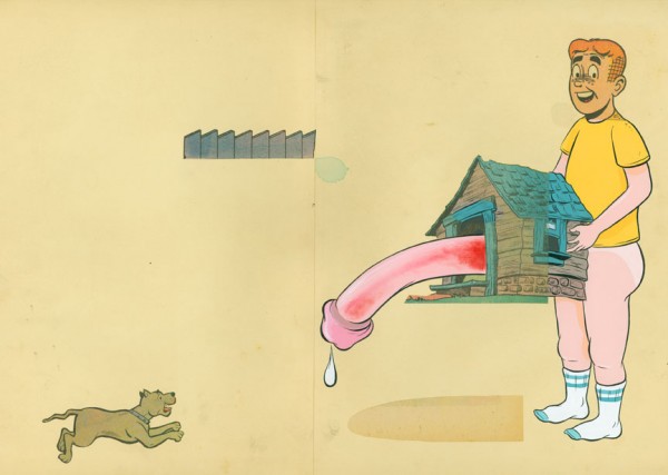 Weatherbee’s Revenge is the title of a new exhibition featuring works by Mark Mulroney, which opened last night at Chicago’s Ebersmoore Gallery. When the artist was a child, his mother gave him a book titled “What’s Happening To Me?” in hopes of answering all of his questions concerning puberty and sex. For the show, Mulroney continues his irreverent imagery through a new series of works on paper which explore his youthful and naive understanding of sex as an adolescent. The book’s illustrations and texts proved to be completely misleading and altered the artist’s understanding of sex. As a response to the comedy and horror that ensued, the artist has created the work in Weatherbee’s Revenge.