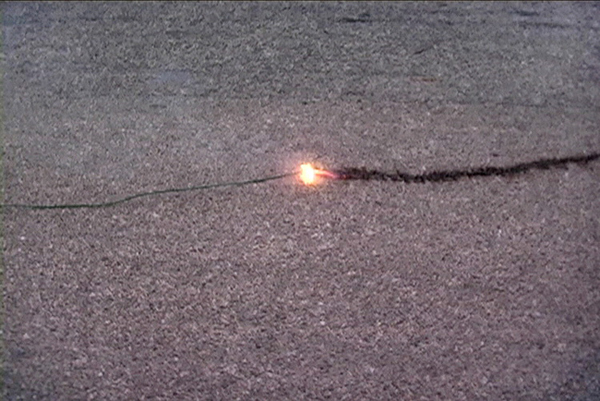 While similar to the performative aspects of Ekberg’s interiors, the outdoor imagery, boundless in many ways, allows the artist to abandon certain restrictive elements and celebrate a personal communion with nature. The positioning of a flashlight on the ground creating an illogically placed beacon of light on the horizon, a duet of balloons in Precise Equilibrium; one helium and one filed with the artist’s breath, and a thrown handful of glitter all point toward self-portraiture minus the actual subject. In his video of a fuse slowly burning on the pavement, the gnarled line gradually disintegrates staining the pavement with a residue of gunpowder, evoking a whole life with beginning, end, unexpected twists, a past, present, and future.