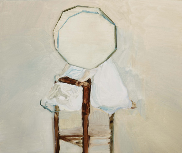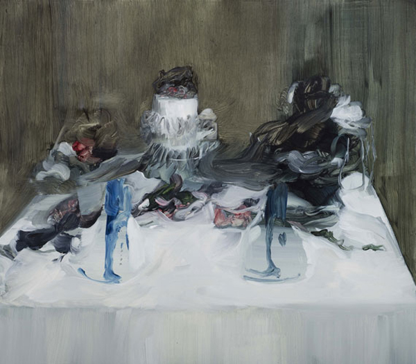 Lara Viana‘s paintings look as if they might have been chiseled down from thick blocks of oil paint, rather than the media having been applied to the surface. The layers of paint in her hauntingly rendered scenes tangle and fold onto one another like rumpled bed sheets. Abandoned dinner parties and smudged, silhouetted flower arrangements are presented in a muted palate that suggests faded memories—so long gone that one might never grasp onto them again. Viana’s new work is currently on view in a solo exhibition at Domo Baal in London—her first solo show at the space, following the 2009 group exhibition, Time is a Sausage.