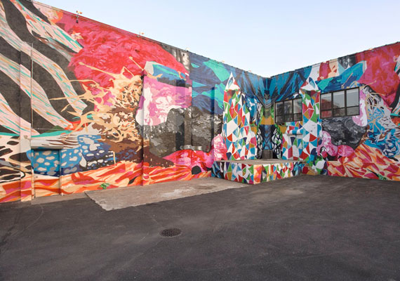 Deitch Studios in Long Island City is currently showing assume vivid astro focus‘ Absolutely Venomous Accurately Fallacious (Naturally Delicious) until August 10th. avaf is a collaborative group of artists, designers, filmmakers, and performers that creates different projects based on each institution and space they visit. They have exhibited all over the world, including at the Kunsthalle Wien in Vienna, and will be participating in the 28th Sao Paolo Biennial. The number of people working on each project varies, and the group always wears masks to encourage the viewers to focus on the work and not their personalities. The exhibition at Deitch is a combination of murals, collages, sculptures, video, and installation, as well as a special zone for experience and interaction (included in every avaf project).