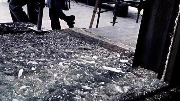 His 2006 work Always After (The Glass House) is the fifth installment in a series of film-based works—created between 2000 and 2006—that directly engage the architecture of Mies van der Rohe. The architect serves as a stage from which Manglano-Ovalle conducts a self-reflexive critique of prevailing notions of “failed modernity.” Despite the many broken promises of modernity, the artist has said, “So much has actually come to fruition….We do live in glass houses.” Shot entirely on location at Crown Hall, van der Rohe’s 1950 school of architecture at the IIT campus in Chicago, the film documents the 2005 ceremonial dedication of the building’s renovation during which the architect’s own grandson broke the windows with a sledgehammer. Manglano-Ovalle captured the entirety of the action and its aftermath on high-speed film, which when played back at normal speed, appears protracted. This combined with the decision to edit all direct indications of the original event from the final display-and an atmospheric soundtrack strategically intercut with periods of silence, resulted in a pared down, nearly abstract image. Panning close-ups show the crystalline shards of broken glass being pushed with a wide broom alongside the feet of anonymous passers-by. Lacking the specificity of context, viewers are left to interpret the scene for themselves.