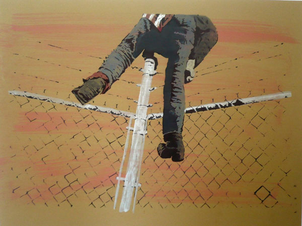 Within Chris Stain‘s installation, the viewer briefly navigates the nooks and crannies of a constricted space between two buildings. His corridor-like construction embodies subculture with multiple depictions of bricks, graffiti, and graphic renderings of telephone poles and electrical wires. Stain thinks of the space as “…a 3-D representation of the smaller paintings I make on metal, which capture the story of the struggling American.”