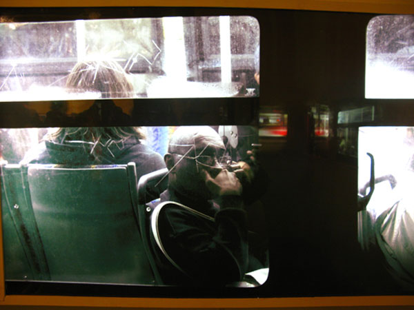 Similarly, Dan Monick and Caitlin Reilly collaborated to make their room into a bus stop with a partially enclosed waiting area and bench. The team installed lighting meant to mimic the overhead illumination of a street lamp. In addition, photographic images are installed on light boxes that surround the perimeter of the room. These images, which are approximately the same size as bus windows, are portraits of passengers and their surroundings.