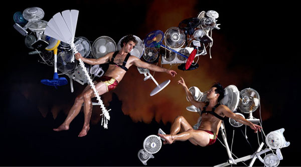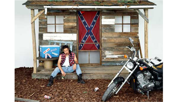 SunTek Chung creates images of identity forged from concepts about culture and technology. Like all of his photographs, SunTek makes a real space for us to examine. He challenges the integrity and meaning of artifacts that are marginalized by their own popularity. In his image The South The South, a drunken motorcyclist minds his business on the stoop of his marsh shack facade, drinking tall boys out of his well-traveled cooler. He’s surrounded by pine bark mulch, the remnants of the oldpine forest. Set in the door of his shack is a strange southern flag. The yin and Yankee colored Saint Andrew’s Cross holds the symbols of heaven, earth, fire, and water, made white like the stars. The background of the Korean flag, the color of cleanliness and light, has been changed to red, the yang spilled all over the flag.The purity of the cause is questioned and the white flag as a symbol of truce or peace has been subverted. There’s a skewed parallel between South Korea and the Confederacy that the drunk is not required to explain. But, there’s a spirit of rebellion and autonomy in freedom from both government control and communism. The stereotype of the Asian imitation of American things is subverted. The Korean and American products are interchangeable and impure.
