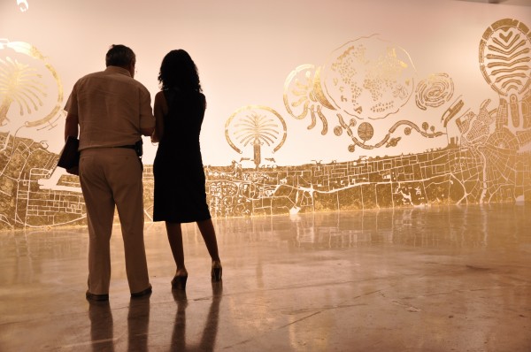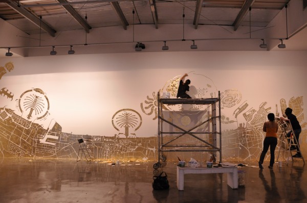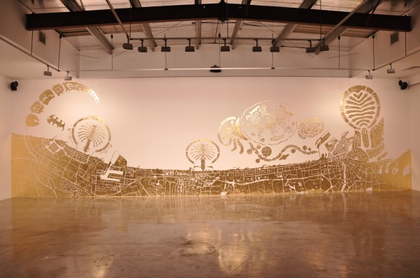 The Third Line in Dubai presents Islands – Abbas Akhavan’s first solo exhibition in the region.  According to The Third Line, Akhavan’s site specific installation visualizes the connections between the art world/art market and the world’s economy.  Akhavan positions this global economic theme within Dubai – mapping the city directly onto the gallery walls.