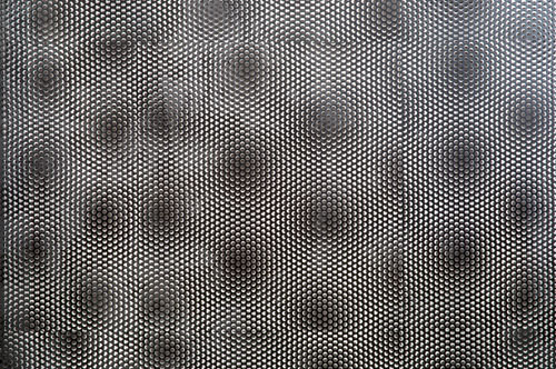 Holloway’s installation is more immediate. He engulfs his audience in an experience but he doesn’t require anything of us, nor does his work offer us anything that we don’t already have. He essentially says, “Here, look at how this familiar vocabulary of dots and holes can conjure up an experience.” Just one look around the gallery leads to a trippy sensation. The installation begs for free-association – it’s pixels gone gaga, a psychedelic trip in monochrome, or your favorite polka dot t-shirt stretched across the length of a room.