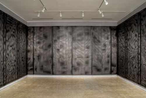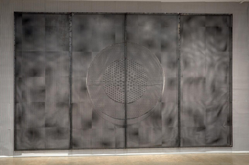 Holloway’s installation seems like the perfect place to listen to Zeppelin’s “Stairway to Heaven” or Lou Reed’s “Heroin” – it’s portentous and lulling, just like 70s rock at its best. But Holloway’s work also has the calculated restraint associated with minimalism. Pages of black dots cover nearly every inch of the gallery walls and a lightly gridded metal screen, installed to hang a few inches from the wall, adds a layer of empty holes. The holes and dots move in and out of each other, turning the exhibition into a brain tease that reconfigures itself every time you turn your head. The room only stops moving if you stand still and pick a spot of wall to stare at. At first, the installation seems like a lighthearted foray into the haphazard vernaculars of classic rock and youth culture. But an undercurrent of indecision and mistrust tampers with the fun.