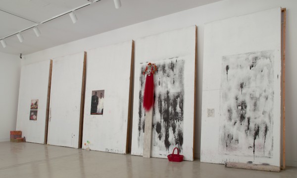 Amanda Ross-Ho’s installation, Frauds for an Inside Job (2008) is in fact her former studio. Cut apart and reassembled as leaning “paintings”, a presentation that she often uses, Ross-Ho presents the objects that are often found on her studio walls. A poster of Puff Daddy and Notorious B.I.G., paint splatters, buttons, a basket, and a Beijing Opera Mask are all disclosed as references and inspiration.