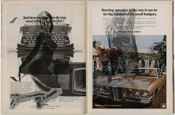 Heinecken had the tools he needed to argue, but not to conquer. The exciting and frightening aspect of his work is that it’s endlessly caught in the web of its source material. Even though Heinecken breaks into imagery, superimposing pin-up girls over domesticated car ads and cutting body parts out of magazine spreads, he never breaks out of it. But breaking out isn’t the point; needing to argue is.