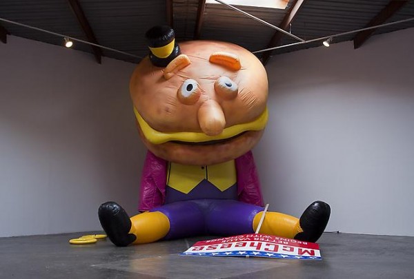 In the main section of the gallery, the artist presents two large inflatables, which dominate the space. Upon entering the gallery, the viewer comes across a large inflatable of the Mobil Oil Pegasus, lying on its side in a shallow pool of oil. This creature is followed by another large inflatable sculpture, this time of the McDonald’s character Mayor McCheese, who has lost his political stature and is now slumped into a corner. The figure dissolves into a metaphor for all political leaders who have failed in their vain attempt to better the world.