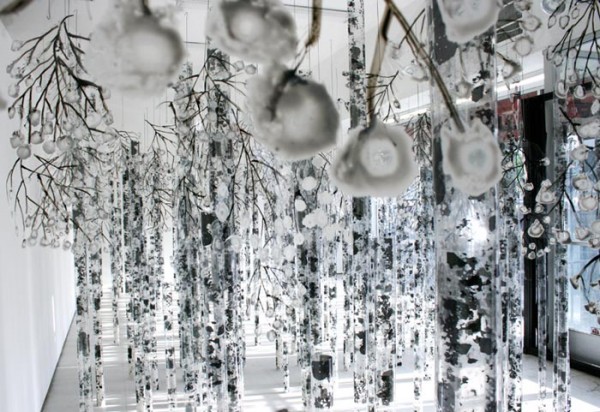 Los Angeles-based artist Meeson Pae Yang creates intricate sculptures and installations that explore technology through the context of the body and the natural world. Developing systems that mimic both micro and macro environments, the artist often builds an entire ecosystem within a singular installation. Meeson Pae Yang’s most recent work, Traverse, takes place in a vacant storefront in California. The artist has built a replica forest-like landscape that is composed of translucent trees which spring from the hard concrete floor. The exhibition combines organic and synthetic material to create the illusion of a deep seated wintry forest.