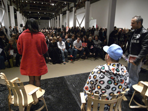 Denise Gray: It really was; I think it was such a highlight for me because it involved the formal talk about art and commerce, very traditional, Powerpoint slide, etc and then this collaborative community art thing and then a performance with this special souvenir that took place at the end. I wanted it that way in that neat package instead of people going crazy and tearing apart this mural, not a free for all; I wanted it structured and special. Although you saw people who were tearing off pieces early or guarding pieces early!
