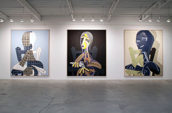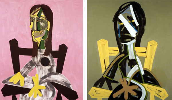 Using Pablo Picasso’s famed 1938 painting titled Portrait de femme (Dora Maar), 1938, as a framework for a new series for formal paintings, both large and small, Los Angeles-based abstract painter John Millei embarked on a series of paintings titled Woman In A Chair. The exhibition, which is on view through July 2010 at Ace Gallery in Beverly Hills, featured a room full of towering paintings, each reaching over eight feet tall, tightly packed along the gallery walls. While the paintings borrow the form of Picasso’s famed painting, they are not specifically concerned with either the subject of Dora Maar, nor Picasso himself. Instead, the image of the woman in a chair serves as a simple armature for the artist to revisit certain stylistic periods of his own career. As the paintings align the wall in close proximity, the viewer can easily compare the seemingly endless variations of a single subject. Lush and voluminous bands of paint sit next to flat graphic spans of color on certain paintings, while others contain tightly woven bands that are placed beside areas of raw canvas. The handling of the paint seems effortless and almost instantaneous, however it is evident that every mark and color combination is careful considered. While the paintings obviously explore Millei’s art historical predecessor in repetition, the work remains playful while carrying the weight of this lineage.