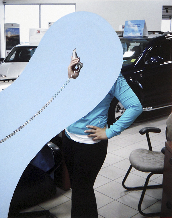 Lee Gainer utilizes the time-honored representation of the dedicated employee, phone-to-ear, as the basis of her new collection. Backgrounds vary, depending on the nature of the organization and the duties of the associate. This snapshot, ubiquitous to the point of being absurd, suggests that a corporation places high value on customer service, and provides access to courteous, efficient employees with pleasant speaking voices and problem solving skills. This image abounded in nearly every industry during the second half of the twentieth century, and has become endearingly archaic. (Note: Coiled phone cord of land line.)