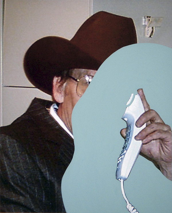 For her most recent body of work, Workin’ Hard, Lee Gainer culls photographs from various business websites and literature, printing the selected imagery with her HP Z2100 printer on 8″ x 10″ satin paper. She then alters the appropriated image with gesso and several layers of acrylic, carefully isolating the hand of the subject that holds the receiver. The artist’s modification of the casual office portrait draws attention to the prolific over-use of this image, challenging its validity as a marker of the white-collar system. Gainer’s socio-cultural observations “invite the viewer to consider the cultural expectations of social status, gender roles, age, race, morality, tradition, and sexuality,” as stated on her website. Each portrait in Workin’ Hard is given a first name as a title, subtly undermining the corporate pretense of “personal” service. The faces of the subjects are obscured.