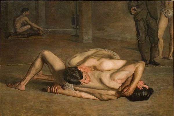 LACMA’s Manly Pursuits: The Sporting Images of Thomas Eakins includes photographs and paintings from the wide-ranging sport-focused repertoire of Eakins, the royal of American Realism. Some are platonic and tame–like The Champion Single Sculls (Max Schmitt in a Single Scull) (1871), in which Max sits mid-water, lost in thought. Others get physically aggressive, like Wrestlers (1899), which shows bodies in a tangle. The exhibition also includes a swath of photographic studies featuring Eakins’ male students in the nude. It’s a show of many Eakins: the anatomist, the observer, the transgressor, the seducer, the sentimentalist. And it’s best when the different Eakins fit together awkwardly, as they do in a series of equestrian and hunting paintings that make conventional manliness look uncomfortable with itself and studies like this tug-of-war photograph in which sincerity becomes erotic and erotic becomes comic.