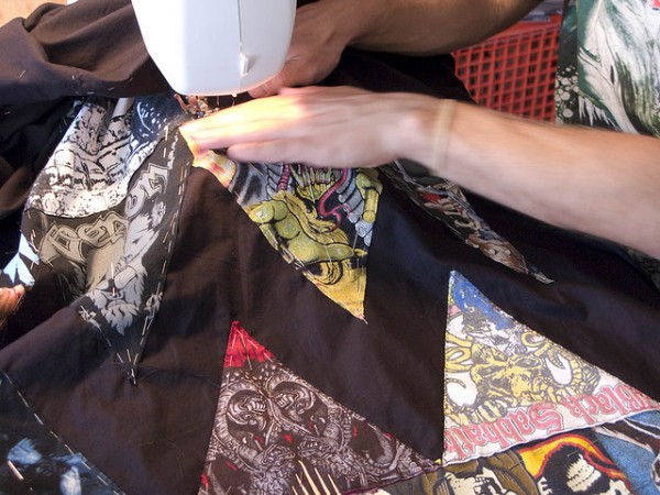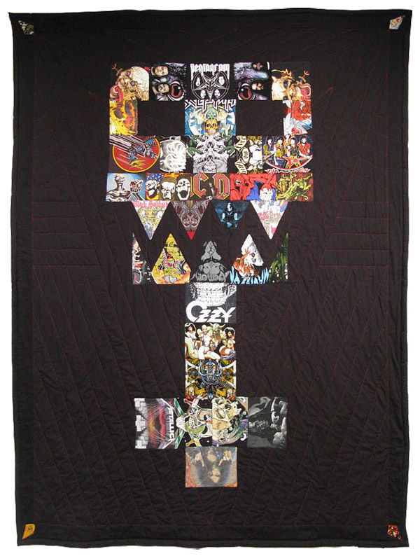 SC: Also, it occurred to me that quilt making is often used as a commemorative or memorial act. I know that it is also very common to see fans use hand made banners to celebrate and show loyalty to their favorite band. Do you feel that the act of quilting and the product that results celebratory in nature? Are these objects a tribute to the rebellious culture that they reference?