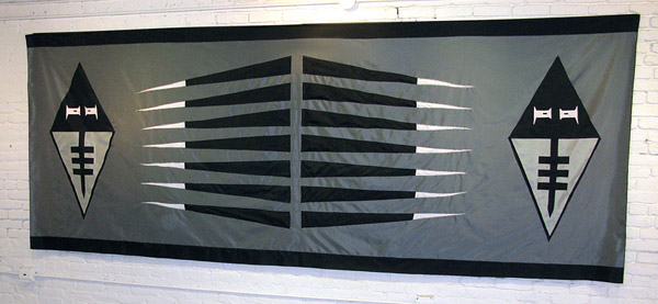 SC: Much of your new work uses imagery and materials that are related to black metal as the aggressive epitome of an already masculine sub culture. You physically unite imagery from this movement by sewing it together into quilts, flags and banners. Where do you derive the source material?