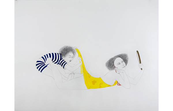 Born in Taiwan but raised in suburban America, Fay Ku’s work explores the dichotomy of two worlds. Her sparse graphite, watercolor, and ink drawings on paper display Eastern influences, at times referencing the Japanese woodcutting technique, ukiyo-e or “pictures of the floating world,” though the subject matter is purely her own. Children and women figure predominately in Ku’s work, often presented precariously straddling the divide between myth and reality. Because of the scale of Ku’s chosen canvas and the subject matter therein, the viewer is forced to investigate every minute limb and figure floating among the large stark white paper. In Deviance, there is a metamorphosis of Ku’s subjects where feminism, coquettishness and innocence are faced with uncertainty and the treacherous adult world.