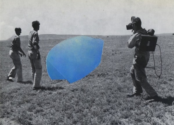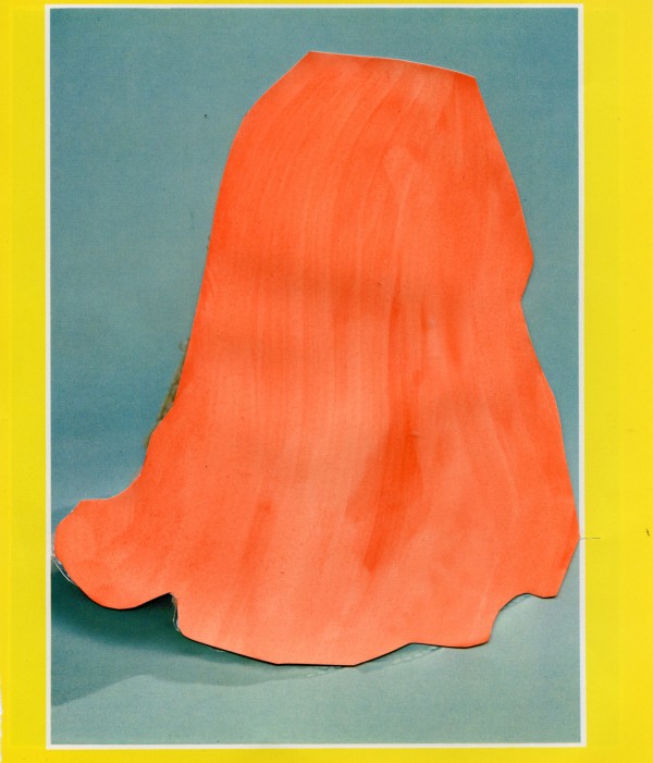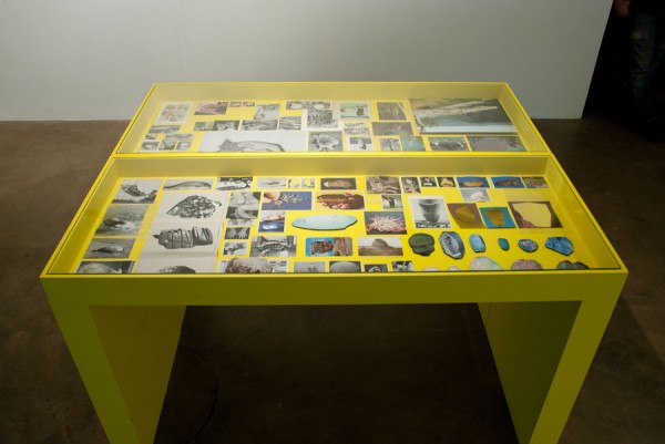 In two vitrines, painted bright yellow, this method is continued using found photographs alluding to the landscape photography of guidebooks and amateur naturalist snapshots. As the press release states, these works are “symbolic of the artist’s longing to travel to other places.” As a result, Van Beek uses collage to combine the two poles of this longing, here and there, creating new interstitial places that are her own.