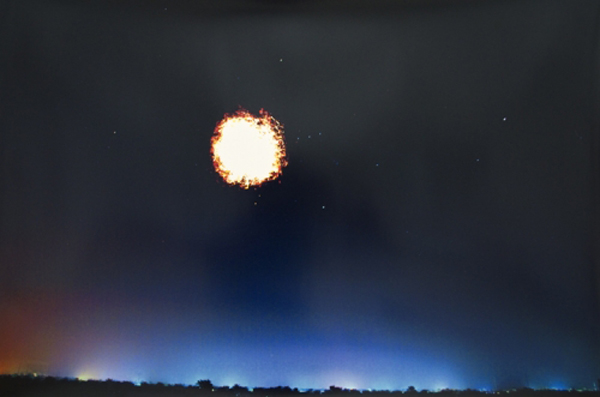 Exemplifying this approach best perhaps within this exhibition is the work new hole (sky). Installed apart from the main gallery of works, it is a modestly sized C-print by comparison to the included mural grids. In it, a starfield above the illuminated horizon is interrupted by a fireball, or possibly wormhole, that has been introduced into the landscape via Mann’s painterly chemical alteration.