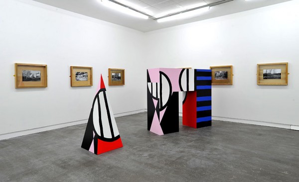 Direct serious action is therefore necessary disrupts structures and the sets of established relationships within a work of art and its presentation, through investigating the role of text and rituals. In contrast to the didactic role of language within exhibitions, the written language in this case appears as a work of art in itself. A folded yellow handout with an image of a man on a horse is circulated prior to the exhibition, and is paired with text containing a first-person tirade in Glaswegian street language, of the blind eye cast by politicians to the situation of the working class. The title and language of the narration evokes an attitude, and seems dislocated thematically from the exhibition, playing against norms regarding how text serves as a filter for art. Individual labels for the individual pieces are absent in the galleries, and labels for the black and white photographs of Glasgow scenes, are visible only in the handout circulated before the exhibition and are placed in a way to describe the image of the man on the horse. In doing so, it questions the extent to which text produces art and the point at which a work is regarded as art when it enters a gallery space. The use of repetition – through a repeated phrase in the text, geometric patterns on the sculptural pieces, and repeated prints in the black and white photographs – serve more as connotative than aesthetic devices, in revealing the nature of their work in expressing systems in art.
