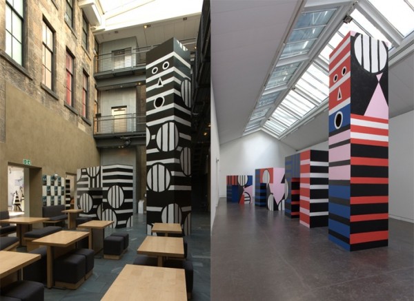 The notion of a site, as both imaginary and physical locations are probed into, as the works take reference from or call attention to the mythical site of Scotland’s Loch Ness monster and the immediate context of CCA as historical architecture and exhibition site. As a creature whose physical absence creates an enduring mythic quality, imaginations surrounding the Loch Ness monster take on monumental stature, through large totemic structural pieces winding their way from the entrance through the cafe into the galleries. They draw attention to the architecture of CCA, where refurbishment in the 1990s revealed core sections of the Victorian-era Greek-styled building. Placed both outside and inside the galleries, the juxtaposition questions the function of spaces in relation to art. While in the cafe, they appear as architectural features for visitors to circulate around. When placed in the conventions of a white-walled gallery, they align themselves to our expectations as works of art to be observed.