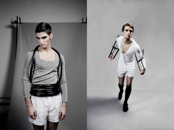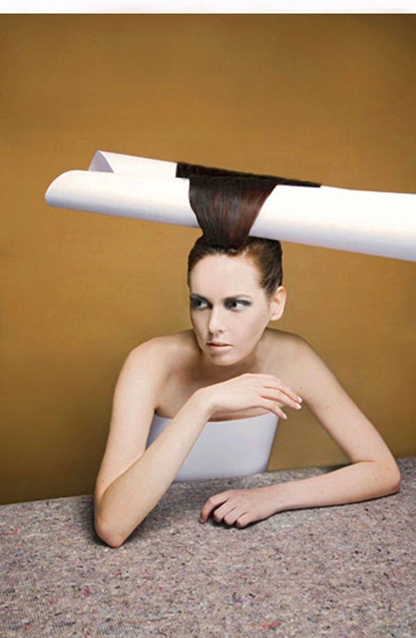 I am always interested in the fine line between design and art. The conversation usually erupts in pursed lipped dialogues that are wonderful in their tenuous confusion. Designers and artists too often set up in one rigidly defined camp or another and fly flags proclaiming the value of the emotional emphasis of art or the pragmatic necessity of design. The ideologically large—but practically small—ravine separating the two is fiercely guarded and both worlds potentially (depending on the stringency of ones alliance) suffer for it. The new work of German artist Sabrina Siedt is a lovely tightrope between the two worlds and one she walks with great elegance. Identifying herself as both a fashion photographer and conceptual artist, Siedt weaves the ideal bodies of her subjects with sculptural elements, the purpose of which is not immediately identifiable nor necessary.
