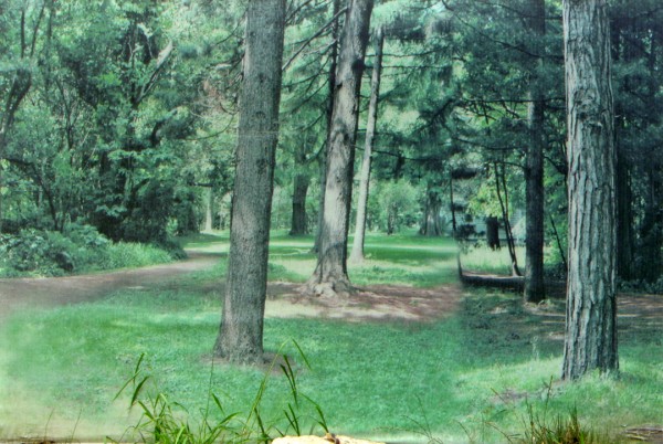 While elevating trash is nothing new in art, Partegàs has a knack for knowing when to exercise supreme control and when to recede. In a group of tree sculptures, each titled Overcast, bags are tied over the branches as if to protect from the elements. At first glance, they seem like castoffs from the Home Depot Garden Center. However, the plastic is heavier than that of your average Hefty bag, making them feel more smothered than protected. The leaves are fluorescent pink and orange, so there is no mistaking these for hyper accurate botanical representations.  A similar real/not real dichotomy exists in You Are Here, a light box photograph of a disjointed woodsy scene. The dream-like slippage in continuity, it turns out, comes from the fact that this is actually a pieced together photograph of a construction fence made to look like a forest. Surprise!