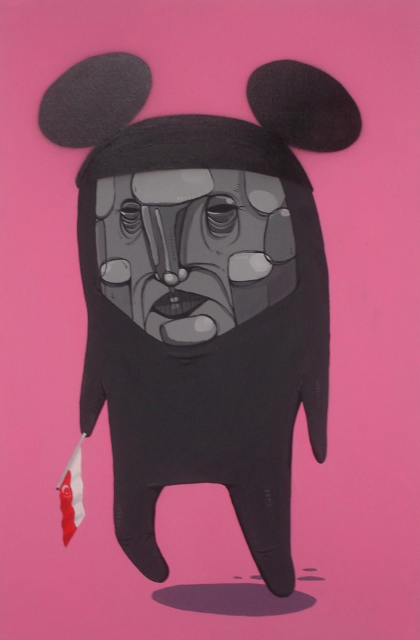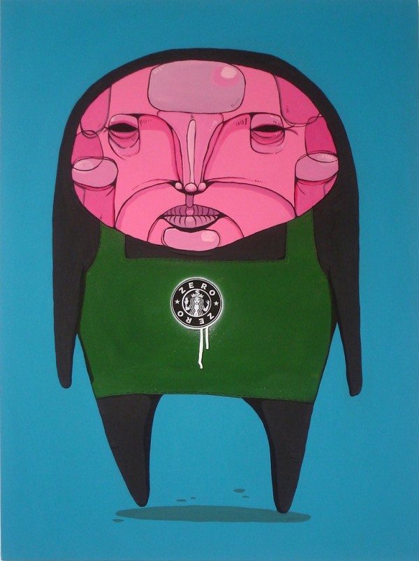 ZERO is a Singaporean whose real name is Zul and he’s been a street artist for a long time. His second solo show, The Spectacular Spectacular, which launched this week at The Substation in Singapore, is displayed complete with a red carpet, blinking lights and famous retail brands like Nike and Nokia. On one side of the space, he sets up a makeshift shop selling limited edition t-shirts silkscreened with the icon he has used in all of his canvas works. Basically, ZERO wants to make use of the idea of branding. When asked about the icon which appears often in his canvas works, ZERO talks about how this icon is deliberately designed in such a way to appear tired and detached from its surroundings. This amorphous icon is an illustrated projection perhaps many can relate to because it is the quintessential person you would meet who is weary and exude a care-less attitude, but naive of the negative impact of his or her choices.