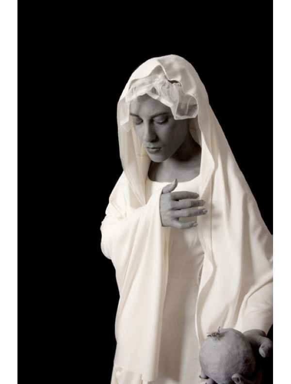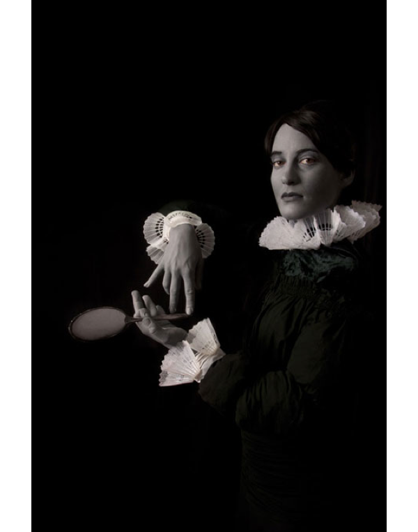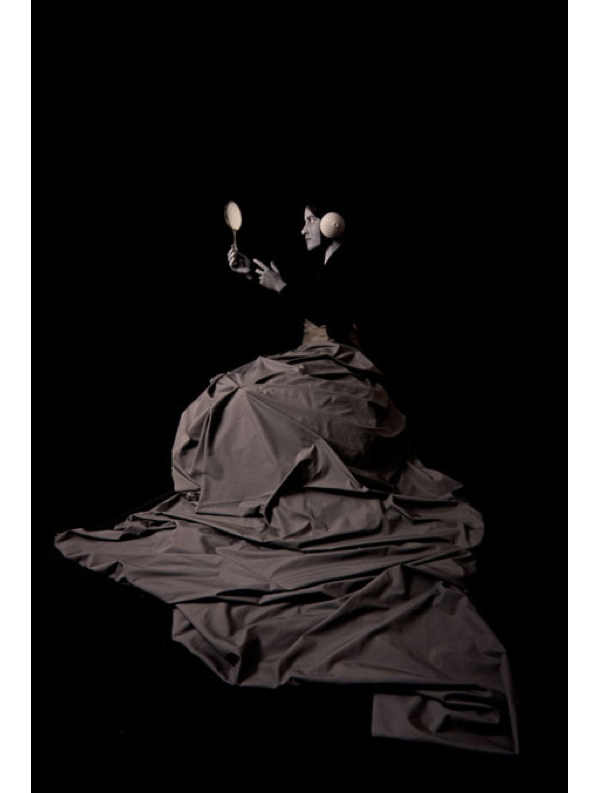 The conceptual twist of the oxymoronic colored black and white photographs comes off as a sort of tongue in cheek—and while this is embedded in the work and is reinforced by De Neiges use of common present day objects, like the badminton shuttle cock that composes the ladies dust ruffle, the photographs have a historically ubiquitous quality. The narrative is self compiling and acquiesces the viewer to pause as the brain goes through a rapid neuro-firing and mis-firing of all the art and world history and photographic techniques knowledge he or she might have stored. All said, the series is a well wrought set of photographs that accomplish quite a lot with a simple, well executed idea that satisfies aesthetic beauty and artistic cleverness.