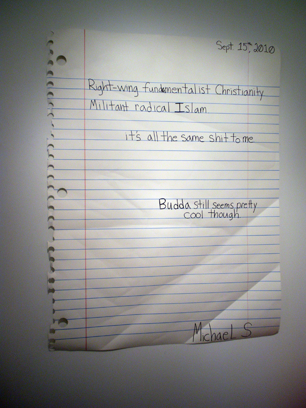 Michael Scoggins‘ gigantic notebook paper attacks against Christianity. Christianity and Islam are not the same thing and this guy is just starting religious conflict for no reason.