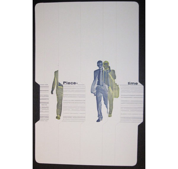 For the last two decades, McVarish has focused on making finely written, designed, die-cut, handset, printed, and bound books. While this was the first exhibition of hers that I’ve seen, A Thousand Several convinced me that her books are her most successful work. Through her medium, McVarish asserts the importance of the book format, and strikingly so in the face of such modern subject matter: information containment, conversation avoidance, and distraction to the highest degree. The exhibition consists of McVarish’s book and prints that hang on the gallery walls. A glass case holds books, and I was permitted to look more closely at A Thousand Several, which is in itself the book form of the exhibition: a compilation of the works on the wall. The contents of the book—unbound and disconnected—create a new code of severance that doesn’t quite translate. This book, much more than the exhibition and works on the wall, captures a real failure of the will to experience the world around us—and McVarish depicts it with great poetics.