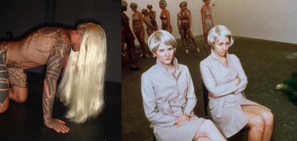 Around 2003, Vanessa Beecroft purportedly shaved off her hair (though I’ve been unable to find any documentation of this). “I watched a few too many Holocaust films,” she told The New Yorker’s Judith Thurman. Nothing screams stoicism like self-inflicted baldness. It bucks nature, and bucking nature requires self-discipline, something Beecroft and Athey both thrive on. In that one corridor of the MoCA show, the two artists seem to be in the midst of an accidental collaboration, something unlikely to occur in reality (their fundamental interests and audiences are too different). Athey’s toxic body counteract Beecroft’s sterilized, posed ones, and I imagine the blood that pours out of Athey splashing across the hallway and startling the VB women out of their plastic poses.