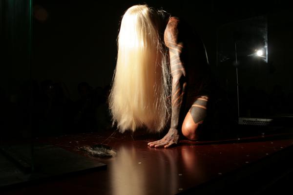 The Self-Obliteration series, an experiment in self-torture, involved “ecstatic” performances. In one, Athey appeared on stage, vigorously brushing long blond hair that fell down over his naked body. It was only when he removed the hair, held onto his bald head by surgical pins, that viewers realized just how much pain he’d been inflicting on himself.