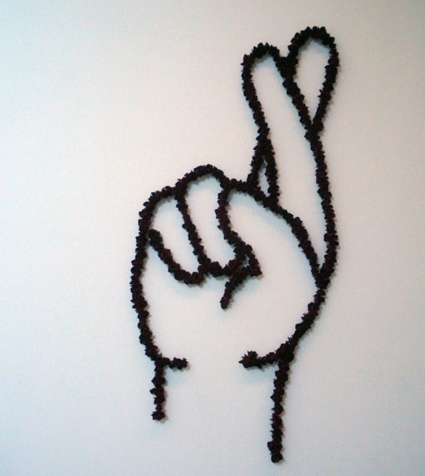 Lastly, Donald Moffett’s Facts, Which If True (Joe McCarthy) is an unusual work from the artist. Instead of being direct and didactic, it is sly and witty. It is effectively a line drawing on the wall of two crossed fingers, made out of fake flowers. It seems to be based off the V for victory or a hippie peace sign, but instead is an ambiguous sign of either hope or a lie. McCarthy hoped that his lies were true, but that did not make them so. This work speaks about how the post war era, the G.I. bill, the anti-communist 50’s, and the peace & love generation are all part of the same process. Without the financial, baby boom, and GI bill there couldn’t be a growth in college education or a 60’s counter-culture on college campuses. This symbol goes right to the heart of post-war America’s propaganda.