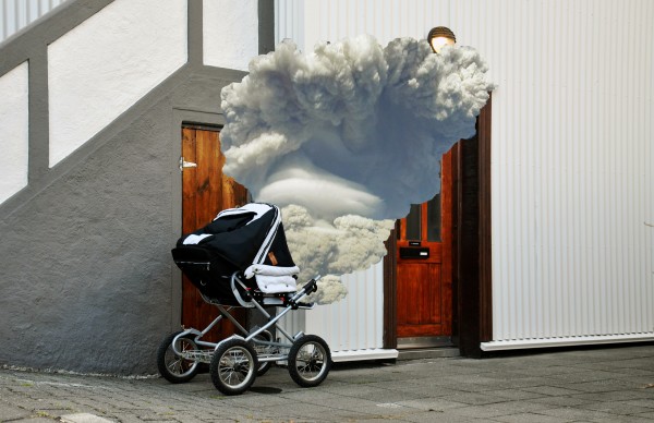 AR: This series is a project that came together while in Iceland. While on walks I quickly began to notice that prams are left outside with infants in them, while the parents go for coffee, groceries, shop, or socialize. I found it linked to my research on the tribal cradleboards. Both cultures use an apparatus to keep the infant safe and secure while they gather food, or in the modernized Icelandic version, go for coffee and drinks. I made a daily habit of photographing these prams with infants in them, seemingly abandoned. The collaged image of the volcanic ash plumes came much later, after I had time to experience and understand the political, geological, and economic upheavals. The ash cloud images are from Google, and are mostly of the Icelandic volcanoes that occurred in March-April 2010. But it was the apparatus that interested me most, and the fact that it became a metaphor for Iceland’s situation as a whole. It contained something very alive and active, wild but slumbering – similar characteristics of volcanoes, and also of the unforeseen economic corruptions that caused Iceland’s devastating 2008 financial collapse.