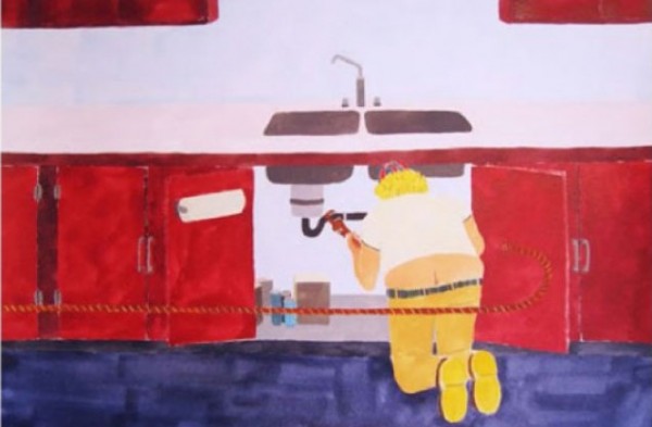 Sola’s soon-to-close exhibition at Happy Lion Gallery in L.A.’s Chinatown, called I found some Bic pens by the railroad tracks, takes gender into a more whimsical but still confrontational arena. It includes a lighthearted collection of self-referential watercolors, a brutally funny video pitting a [male] artists against a [male] collector, and, on January 30th, it also included a performance by Sola and collaborator Michael Webster. The performers—though it was mainly Sola that we watched, while Webster sat behind the piano and provided a perfectly timed soundtrack—wore red and yellow striped vests and black pants that made them look like circus performers. Their slapstick personae were reminiscent of a Charlie Chaplin-Marx Brothers’ hybrid, totally masculine but mocking of masculinity at the same time. Sola had typical junk food, glitter, feathers, and some explosives hidden inside a top hat that had been affixed to a table top (there was no attempt to maintain an illusion as Sola reached through the hat to pull out his props). He also had a blow torch, and the night consisted of dancing; the placing of containers, filled with milk, cheerios, glitter, and the like, on precarious platforms around the gallery; and periodic explosions.