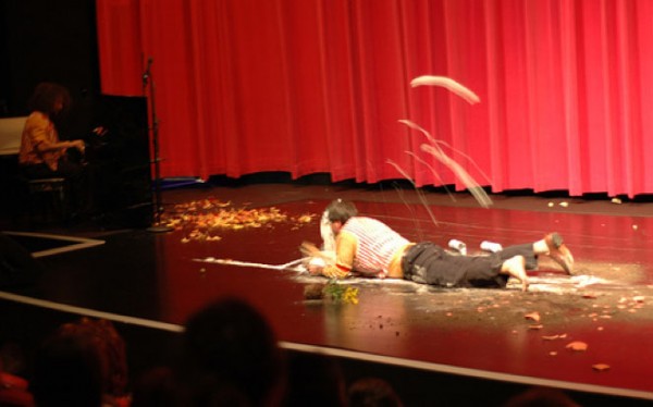Toward the end of the performance, Sola set us up to expect something big. He’d built a contraption out of carboard, feathers, and glue that looked like a miniature horse. And he’d pulled out the blow torch, wordlessly warning people in the front row to don the protective glasses he’d passed out. In preparing for the big explosion, Sola accidentally slipped onto the floor, and he stayed down, waiting for an eruption that never happened. Then, like an injured and disgraced warrior, he pulled himself along the floor with his arms, stopping under each platform, letting bowls of milk and cheerios that had been placed on precarious platforms around the gallery fall on his head. By the end of the evening, his pants were collages of feathers, glitter and food, glued together with milk. This was as rewarding a game as any Super Bowl I’ve ever watched, because it showed how much the failure to perform could hurt, but it also showed failure to be an inevitable part of performing gender or anything else.