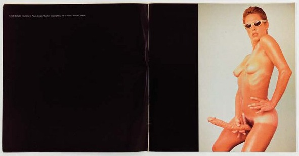 Where she completely kicks ass, however, is in her randy sense of iconic self-promotion. The photos of her at work on her floor pieces are classics, and the notorious advertisement from the November 1974 issue of Artforum, where she appears nude with slicked back hair holding a dildo between her legs, is still shockingly strong. Even though it’s been written about ad nauseum and reproduced a zillion times, it still packs a punch in person. Shot from below, Benglis appears as monumental as Michelangelo’s David and her image turns about 2,000 years of male-dominated Western Art History on its head. Set against a stark black rectangle, it’s as if Benglis is literally turning the page on Minimalism’s colorless form and gender hierarchy in the most in-your-face way possible. So what if feminists at the time hated it—Benglis was likely the first female artist to consciously construct a heroic artistic persona, and that took bigger balls than just throwing a vaginal reference or two into her work.