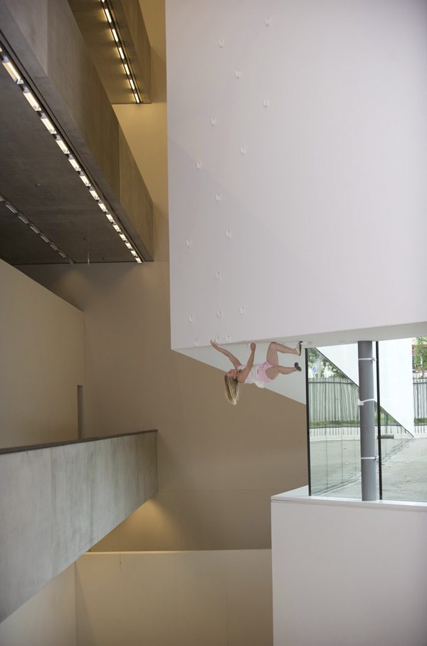 Concurrent with the film festival award, DRAWING RESTRAINT 17, one of Barney’s most recent works, will be screened here in San Francisco in the Kabuki Theater in Japantown. For the first time, he is not the protagonist of the series. Rather, in a split screen projection, a young blonde woman is shown scaling the sharp, modernist edges of the interior walls of the Schaulager Museum in Basel, Switzerland. The action echoes several earlier iterations of the DRAWING RESTRAINT series, in which Barney scaled museum walls (particularly, DRAWING RESTRAINT 11 and 12). This new work also recalls Barney’s video, Blind Perineum (1991), in which the artist scaled the walls of the Barbara Gladstone Gallery in New York, wearing nothing but the harness to secure his climb.