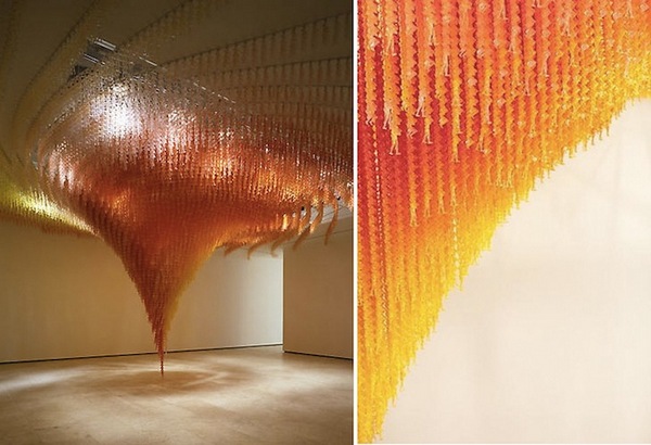 A cursory look suggests that variations on the themes of individuality (as opposed to the collective social unit) and transcultural displacement dominate Do-Ho Suh’s oeuvre. Fabricated in nylon, Staircase (2003) is a gauzy blanket of red that hangs suspended from a ceiling spanning 2 floors, an ethereal, translucent replica of his living space in Chelsea, New York in which viewers can peer – rather obliquely – into the open spaces of both storeys. Portable and set adrift in space, it is in such specific architectural structures of transition and liminality – staircases, arches, and gates – that Suh’s physically flimsy entities do not touch the ground but stretch seemingly into the sky, recalling the equally volatile and hazy ideas of home, while simultaneously sustaining a discourse of the limitations of public and personal space.
