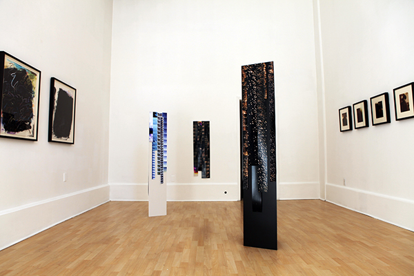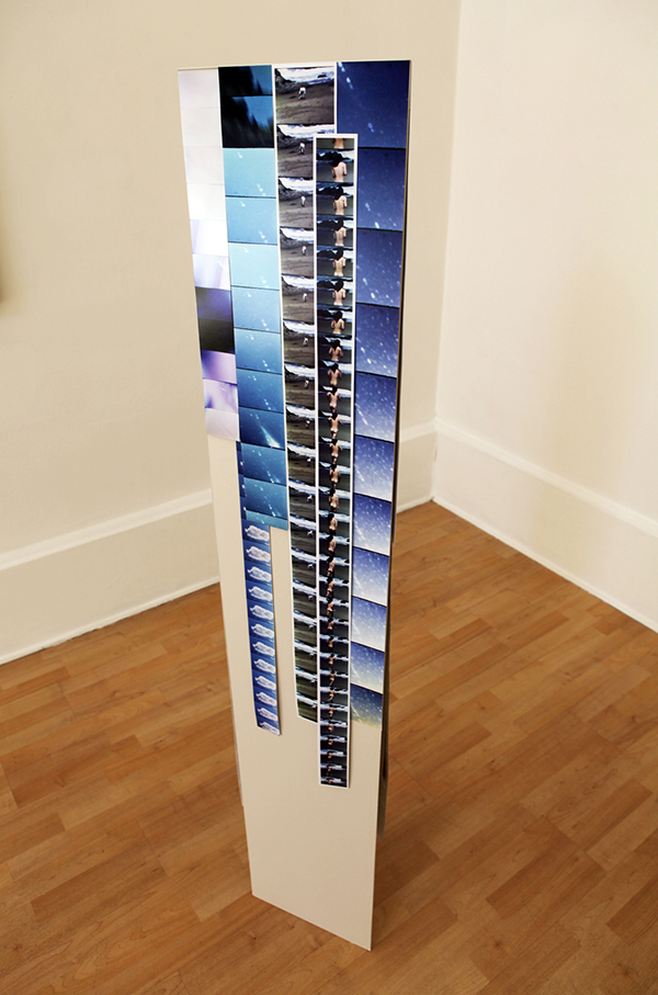 The substance of the show, however, is the pillars in the center of the floor (Totems, 2011). Standing between four and six feet high, the triangular-shaped Totems are draped with scanned and printed C-prints from Treleaven’s own super-8 films: film strips made positive. Secured only at the top of each pillar, they hang loosely and overlap to form an object equal parts collage, photograph, and sculpture. Two out of the three are totally abstract, featuring moments of color and lens flare from the films. The third pillar intermixes frames of light, sky, and a nude young man running away from the camera with a white dog seemingly in tow. These stills, drawn from a visit to Marshall’s Beach in the Presidio, provide the one moment in the entire show in which a narrative becomes fleetingly imaginable. In relation to the mediated abstractions that encircle it, the encounter with a recognizable sense of scale and time is disquieting.