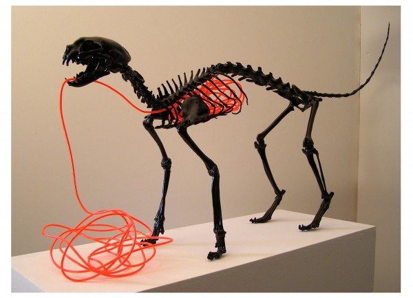 London-based sculptor David A Smith creates organic hybrid sculptures made of glaringly inorganic materials. Fusing skeletal forms with seductive materials, Smith’s enticingly slick animals vomit up their phosphorescent insides, as in ‘Banshee’ – an excavated prehistoric form constructed of conspicuous synthetic products.